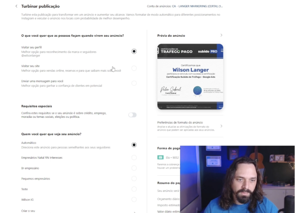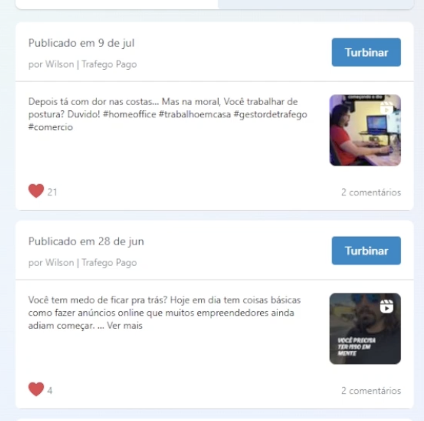 Feito o login, basta escolher o post para turbinar, clica no botão turbinar e seguir o passo a passo do instagram, aqui recomendamos 90% dos casos “visitas ao perfil” e público automático, mas você pode testar com segmentações diferentes e escolher públicos por ali mesmo é super simples!